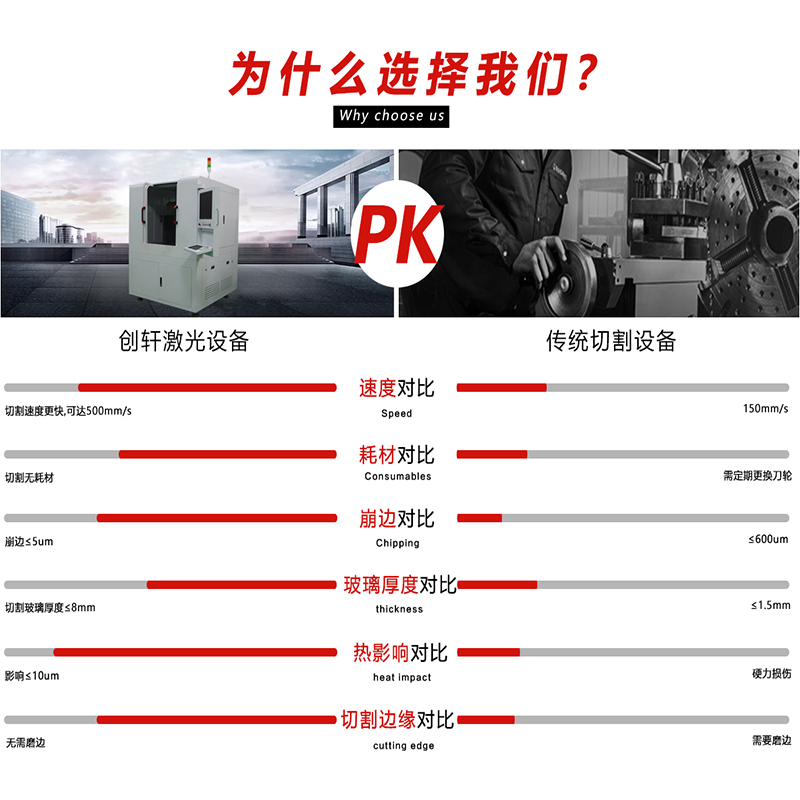 玻璃激光切割机采用超短脉冲的紫外皮秒激光器,热影响区域更小,切割更精细,适合3C电子行业内各种玻璃制品的精细加工。